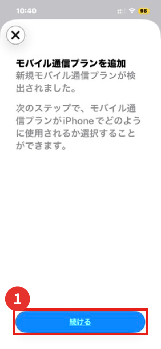 通知のタップから直接来た場合「eSIMを設定」を、もしくは、QRコード等でモバイル通信プランを追加した場合 eSIMをアクティベート画面より「続ける」をタップし、eSIMをアクティベートします。
