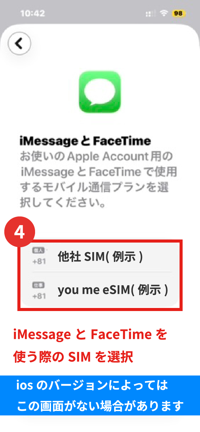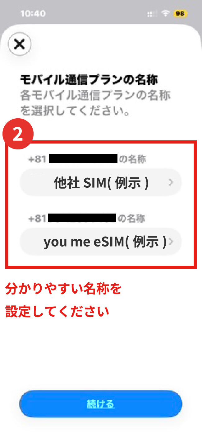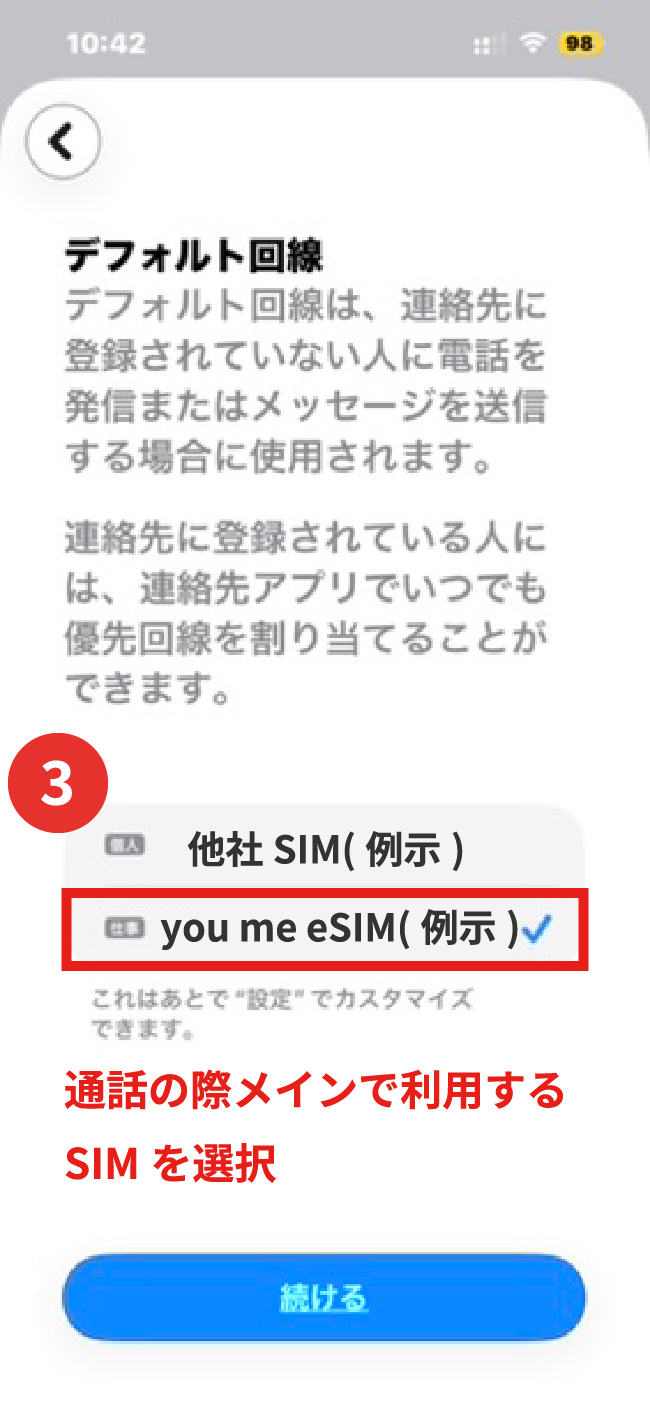 モバイルデータ通信」が「you me mobileのeSIM(例示)」になっているか確認します。