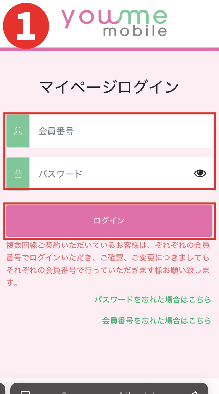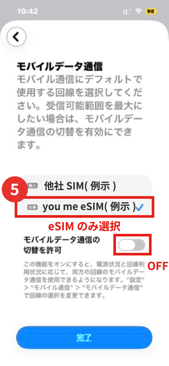 ⑤の重要画面のモバイルデータ通信の画面で、デフォルト回線は「you me mobileのeSIM」を必ず選択し、モバイルデータ通信の切り替えを許可は「オフ」にしてください。正しく設定しないとデータ通信が利用できません。