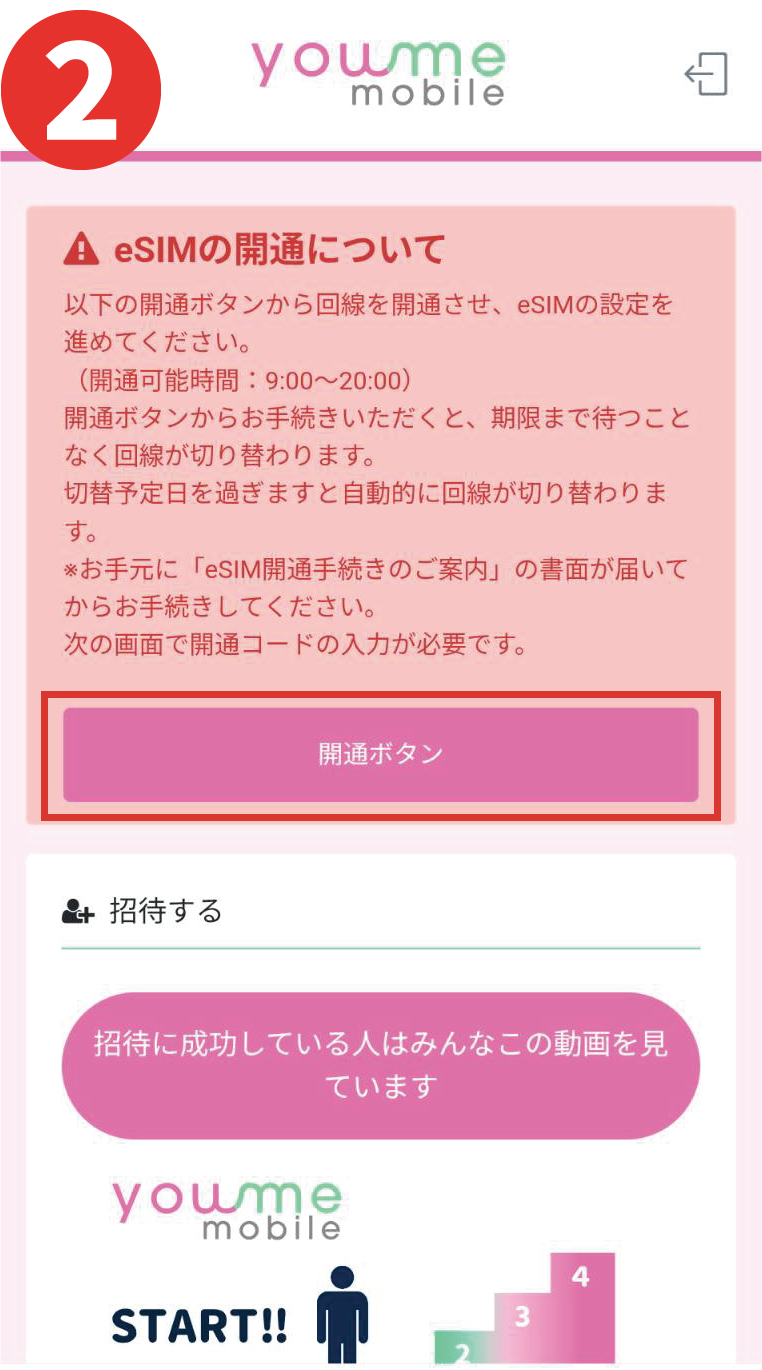 1. ※SIM→eSIMに変更・eSIMの再発行(機種変更)の場合、「eSIM再発行受付完了のお知らせ」メールが届きましたら「STEP.1 開通手続き」から、eSIMの再発行(EID変更無し)の場合は、「STEP. 2 eSIMの設定」手続きを行ってください。