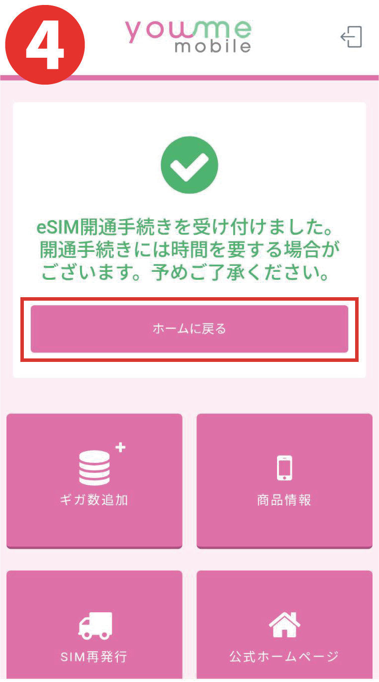 開通が完了しましたらメールが送られます。メールが届いたら「STEP.2 eSIMの設定」に進んでください。また、マイページより契約内容のご案内がダウンロードできるようになります。(メールが届かなくても、マイページ上でも開通完了と画面が切り替わります)